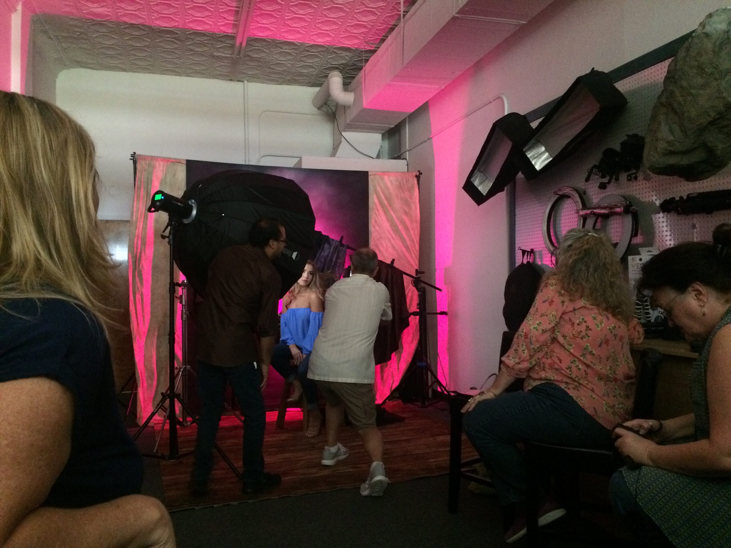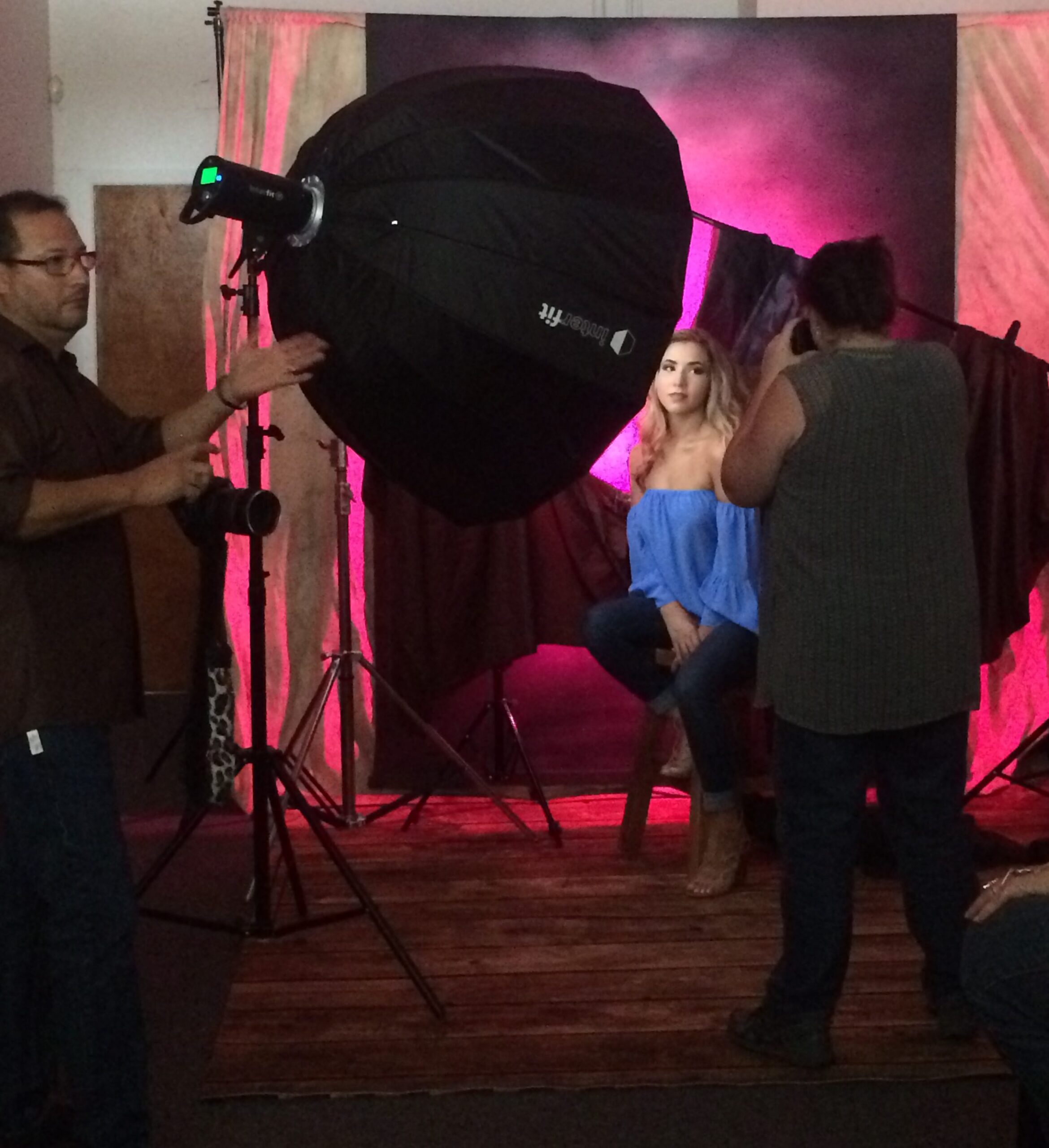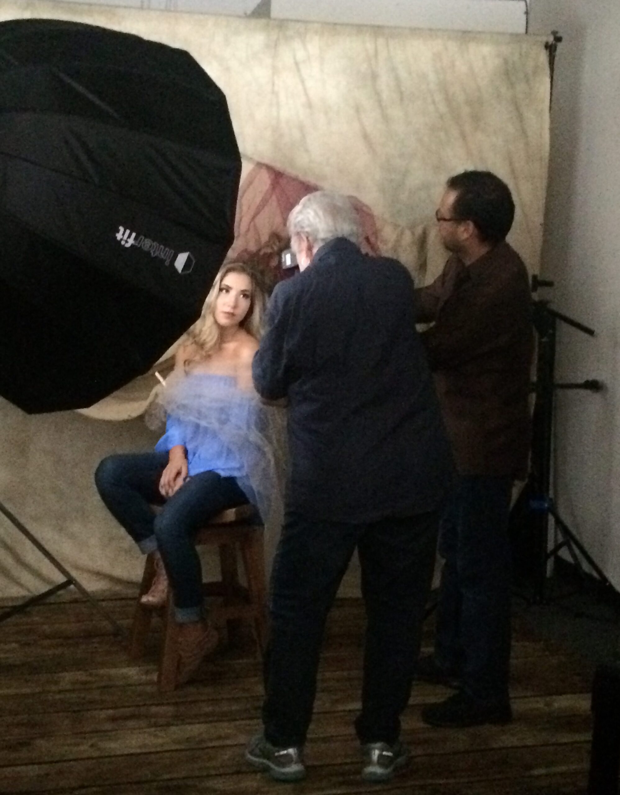 The workshop started at 3:00 p.m. and the studio was designed for an in studio photography session geared for a head and shoulder portrait session. The model Avery was asked to wear a loose fitting top that could be arranged to show off her shoulders. Avery also had long, beautiful hair which was essential for pulling and pinning so that Xavier and Patrice could photograph her in such a way that would allow a unique painting to be created later in the second half of this workshop for photoshop painting. Here are a few behind the scene images from the photo shoot.