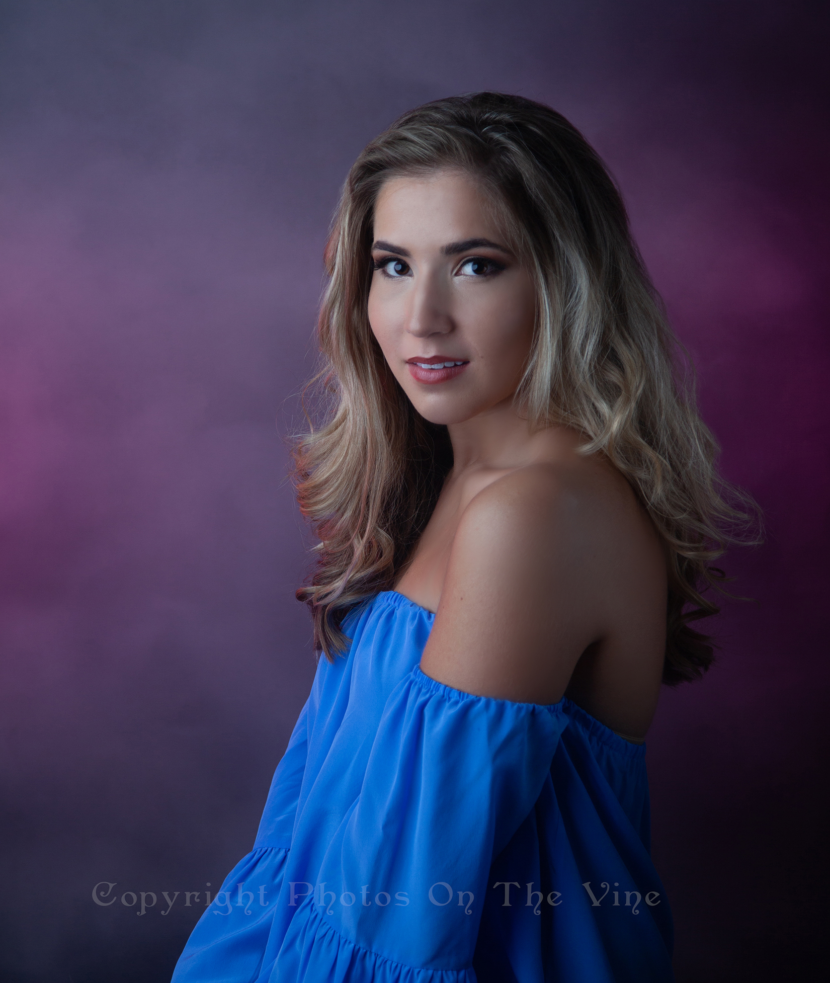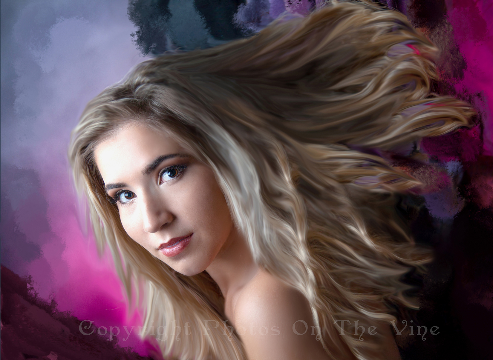 These are 2 of Xavier’s images from the photo shoot that were not created to be painted. The first image was on the first “softer” background, and the second is from the more dramatic background later lit with LED lights. Its always important to photograph some normal head and shoulder portraits for your client before your doing any of your creative work. Its the balance. We do that for our model, and for our client. We hope she will like the final painting we create, but its part of our job to give her a good head shot at the same time.